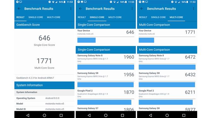 Nicméně kombinace čipové sady a RAM zde není neporazitelná, daleko od ní. Během testu Geekbench 4 jsme zjistili, že Moto E5 dosáhlo jednojádrového skóre 646 a vícejádrového skóre 1771, které jsou oba relativně slabé.