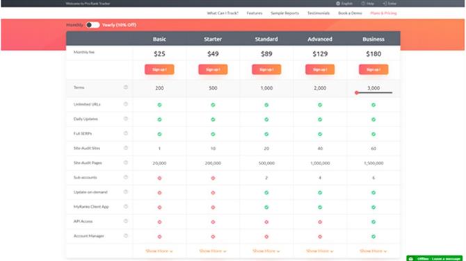 Společnost ProRankTracker se pokusila o pozici nástroje pro výzkum SEO a klíčových slov pro podniky všech velikostí, postrádá však několik funkcí, které by velké společnosti potřebovaly, jako je správa odkazů a integrace s Google Analytics. Díky svým výzkumným službám, snadnému použití a funkcím místního auditu se z něj stal preferovaný nástroj SEO tisíců globálních klientů a je skvělou prací, která vám pomůže posunout své vyhledávací iniciativy na další úroveň..